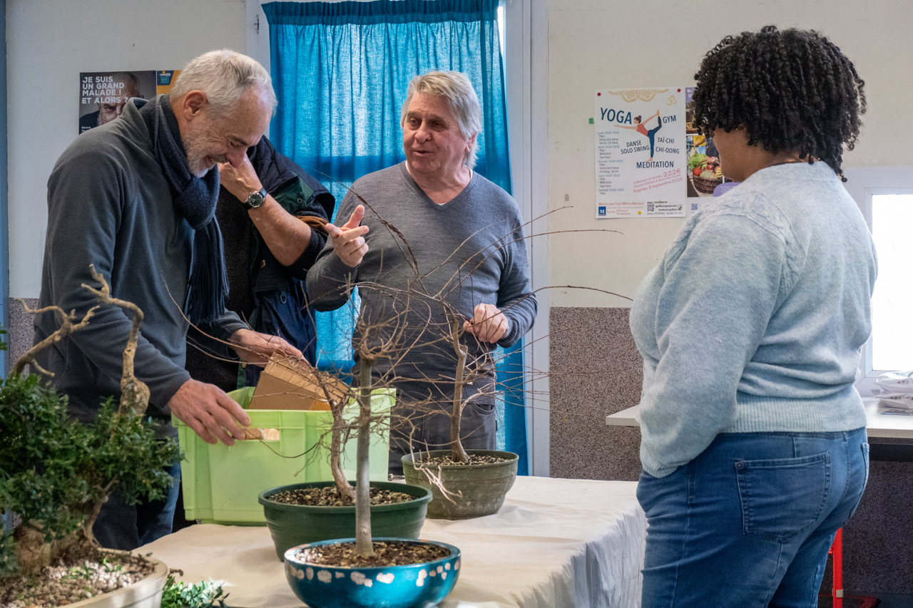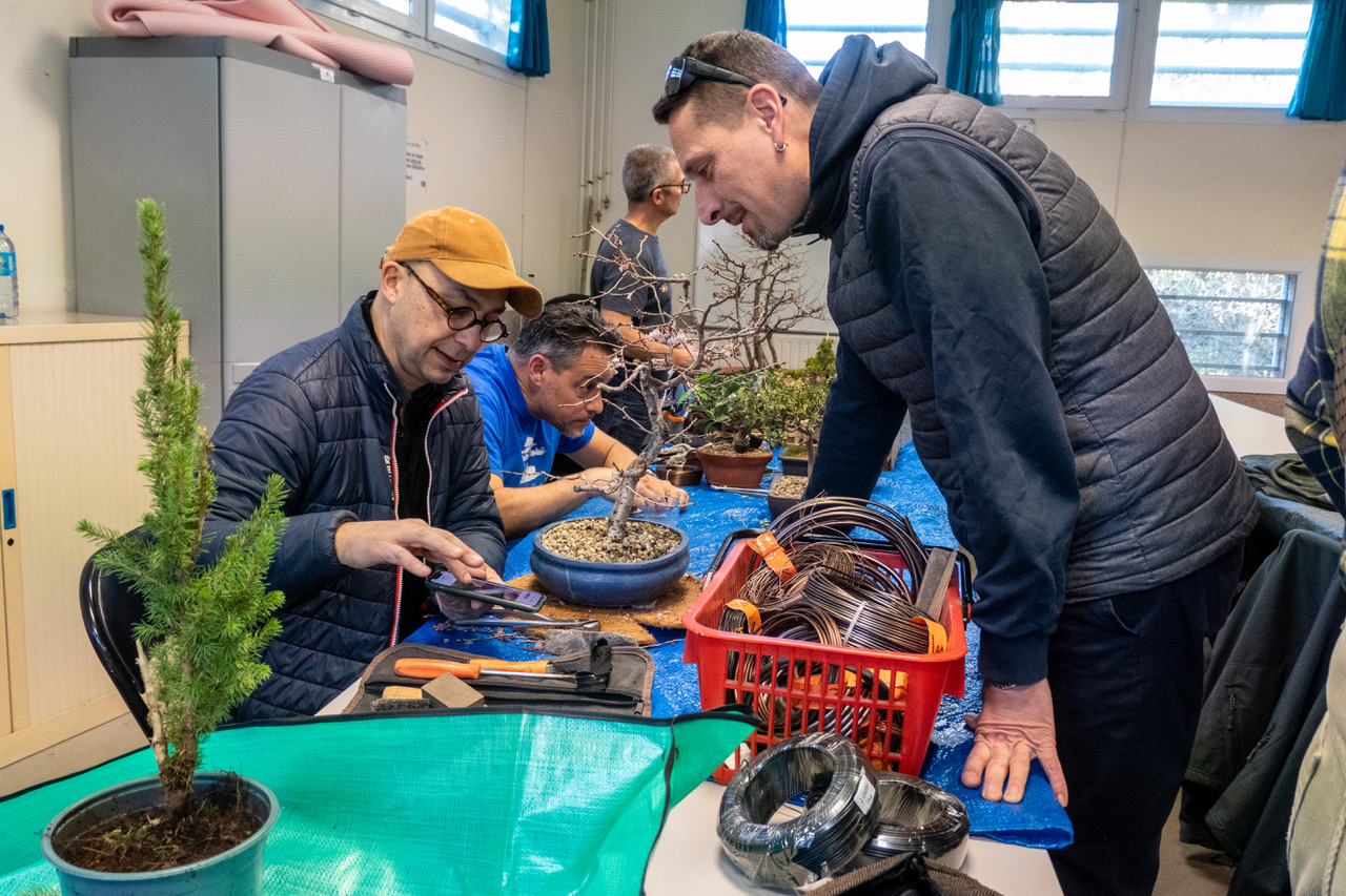 Le samedi matin, les membres du Bonsaï Club Montpellier arrivent avec leurs arbres, outils et projets en tête. L’accueil est informel, les tables s’installent, les échanges commencent déjà autour des arbres et de leur évolution.