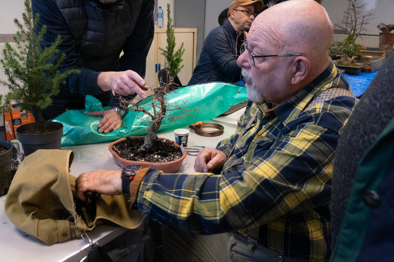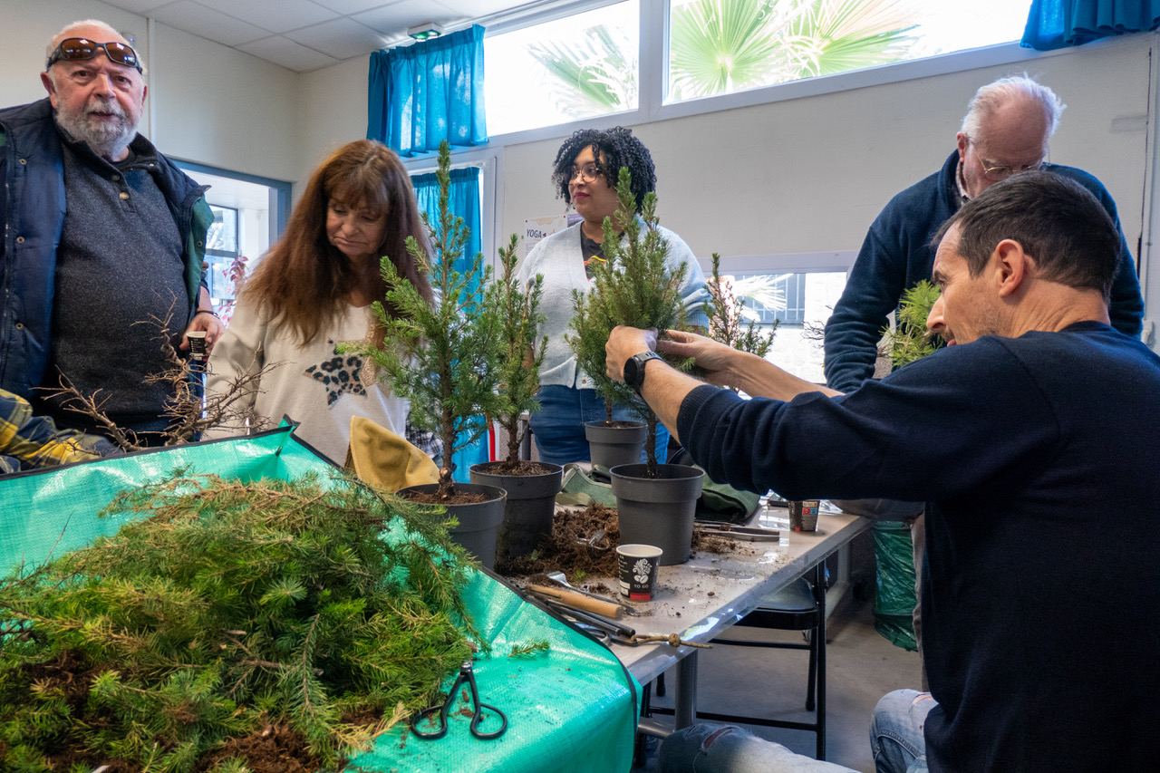 La séance se concentre rapidement sur le travail pratique : taille, ligature, nettoyage ou rempotage selon la saison. Nos animateurs de club circulent pour conseiller, expliquer un choix ou corriger un geste. Les membres plus expérimentés accompagnent également les débutants. Ici, on analyse chaque arbre, sans recette toute faite, avec un objectif clair : le faire progresser durablement.
